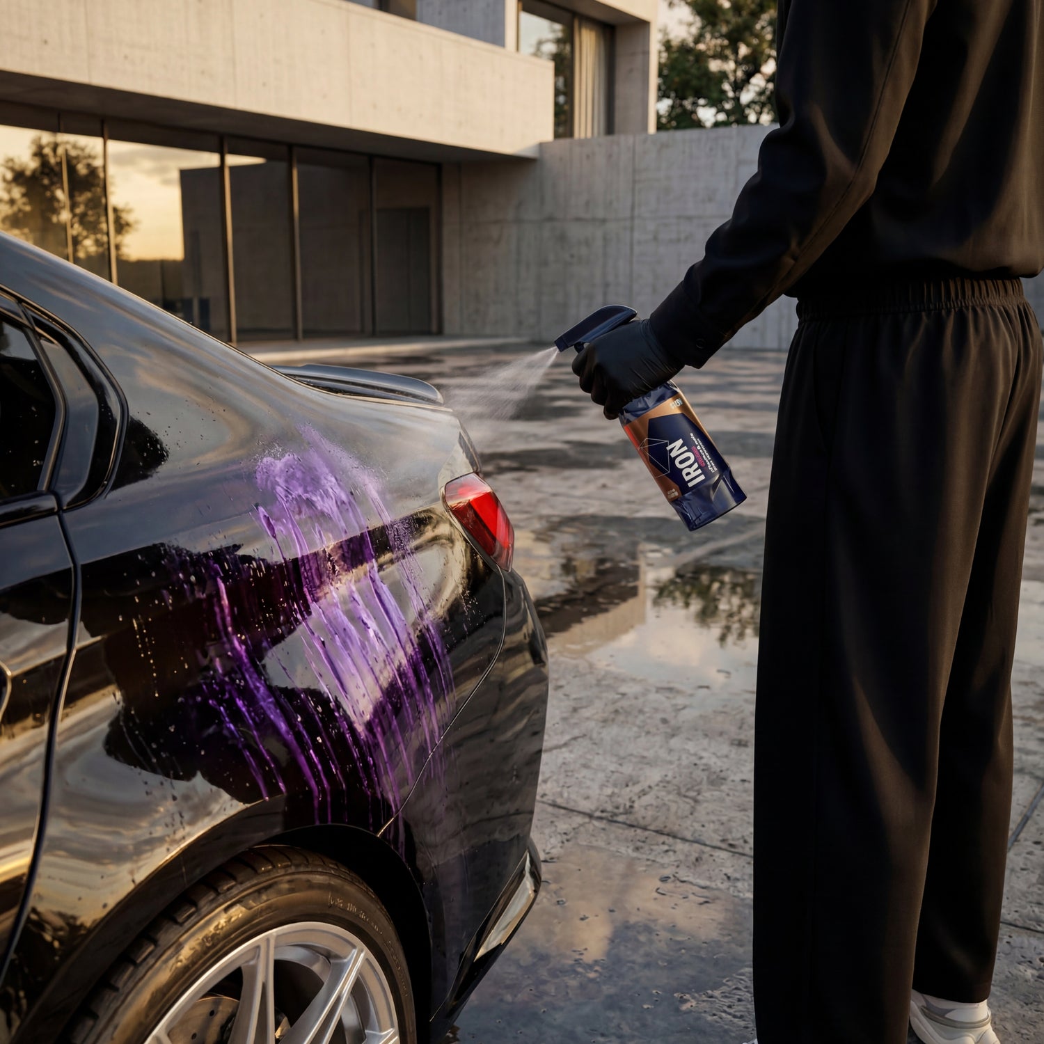 After pre-washing, spray onto the wet paint and allow to dwell for a maximum of 2 minutes. The color change to purple indicates the reaction with iron particles. Then rinse thoroughly with water. Approximately 150 ml is sufficient for one vehicle. Never apply to hot surfaces or in direct sunlight — in case of heavy contamination, prefer a second application rather than extending the dwell time.