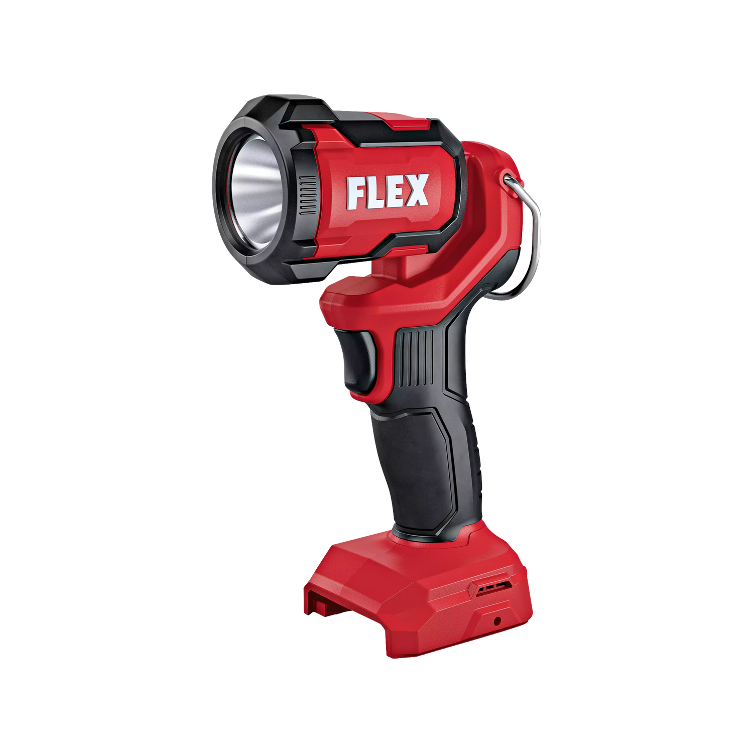 Kabellose 18V LED-Handlampe mit 300 Lumen in zwei Helligkeitsstufen, 104° drehbarem Leuchtenkopf und integriertem Metallbügel. Kompatibel mit allen FLEX 18V Akkupacks. Inkl. Gürtelclip. 0,4 kg ohne Akku. Für mobiles Detailing, Motorraum und Fahrzeuginspektionen.