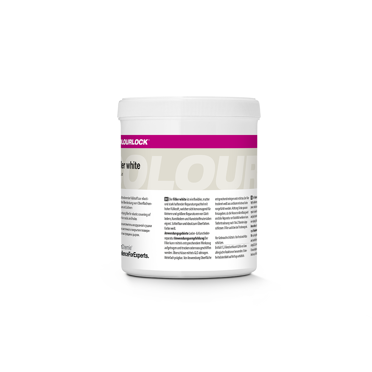 Wofür wird COLOURLOCK Filler White verwendet? — Der weiße Füllstoff gleicht Kratzer, Vertiefungen und Risse in hellem Leder aus und schafft eine glatte, stabile Basis für Farbe, Strukturaufbau und Versiegelung.