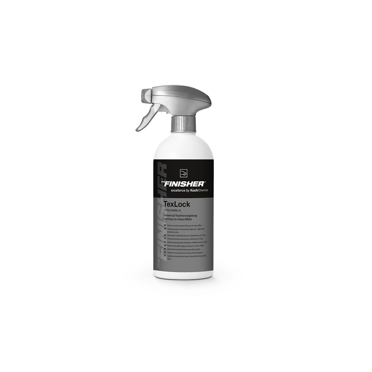 THE FINISHER "TexLock" Textilversiegelung imprägniert Automotive-Textilien unsichtbar hydrophob. Flüssigkeiten perlen ab, Schmutz haftet schlechter, die Pflege wird leichter – ideal nach InsideUp/LeatherTexClean für Sitze, Teppich und Kofferraum.