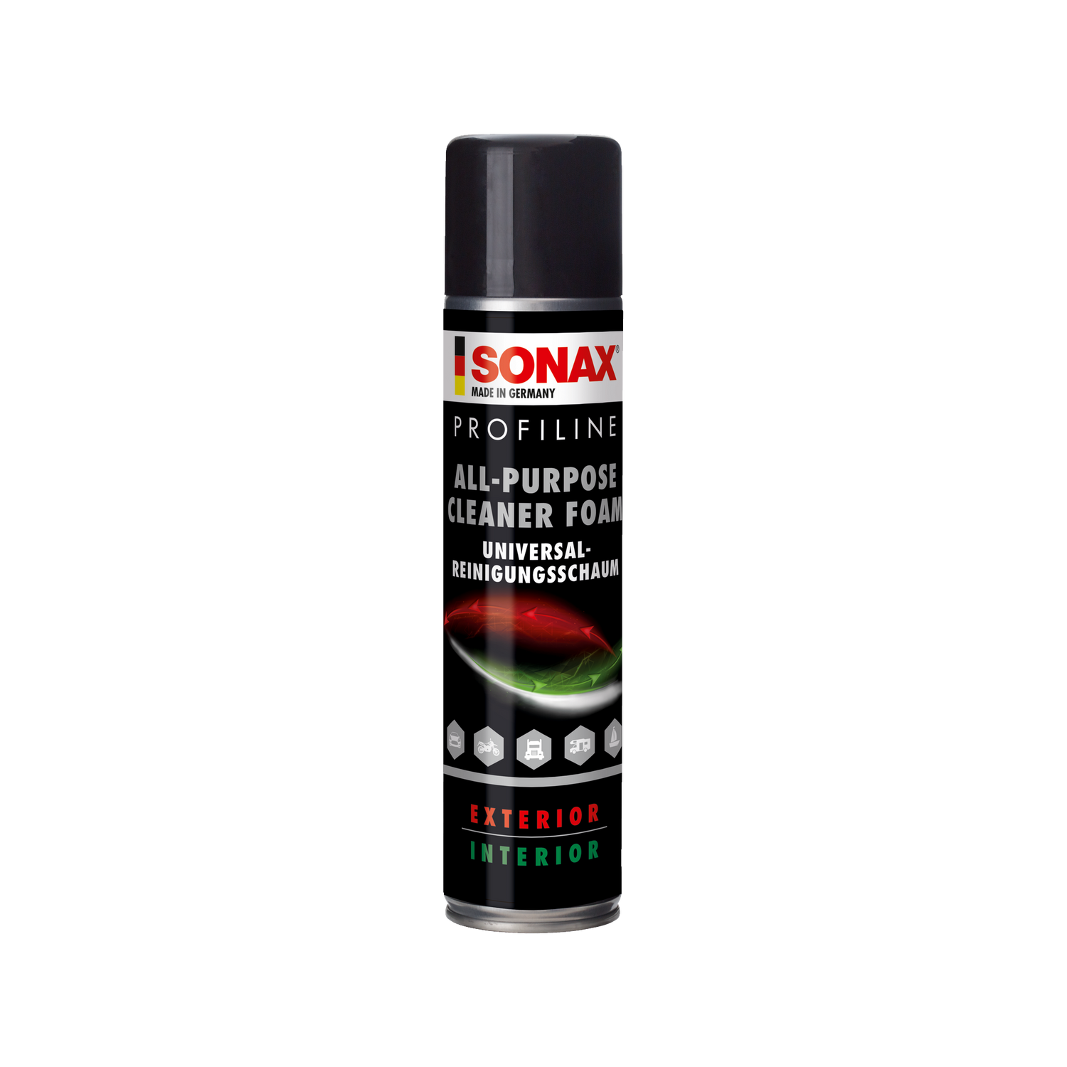 Im PROFILINE Innenraum-Reinigungssortiment ergänzt der APC Foam die anderen Reinigungsprodukte: Der SONAX PROFILINE InnenReiniger ist ein klassischer flüssiger Innenraumreiniger für die Grundreinigung mit Sprühflasche; der SONAX PROFILINE CleanStar "Ecocert" ist der umweltzertifizierte, milde Allrounder für empfindliche Oberflächen. Der APC Foam ergänzt diese als das Format für schnelle, senkrechte Flächenreinigung — wo ein flüssiger Reiniger nicht effizient haftet.