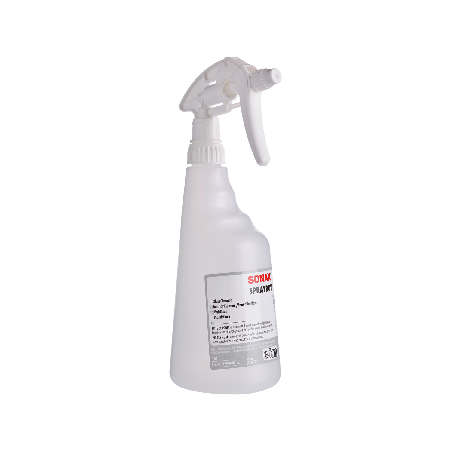 Der SONAX PROFILINE Sprayboy ist als Einzelflasche erhältlich und kann nach Bedarf in beliebiger Stückzahl angeschafft werden. Für einen professionellen Betrieb empfiehlt Detailing1 eine Mindestausstattung von 5–8 Sprayboys, die dauerhaft für verschiedene Produkte reserviert sind: ein Sprayboy für Vorreiniger (alkalisch), einer für Glasreiniger, einer für Innenraumreiniger, einer für QuickDetailer/Sprühversiegelung, einer für Felgenreiniger und einer als Reserve oder für ein weiteres Spezialprodukt. Mit dieser Bestückung deckt das Sprayboy-System alle Standard-Reinigungsphasen einer Vollaufbereitung ab.