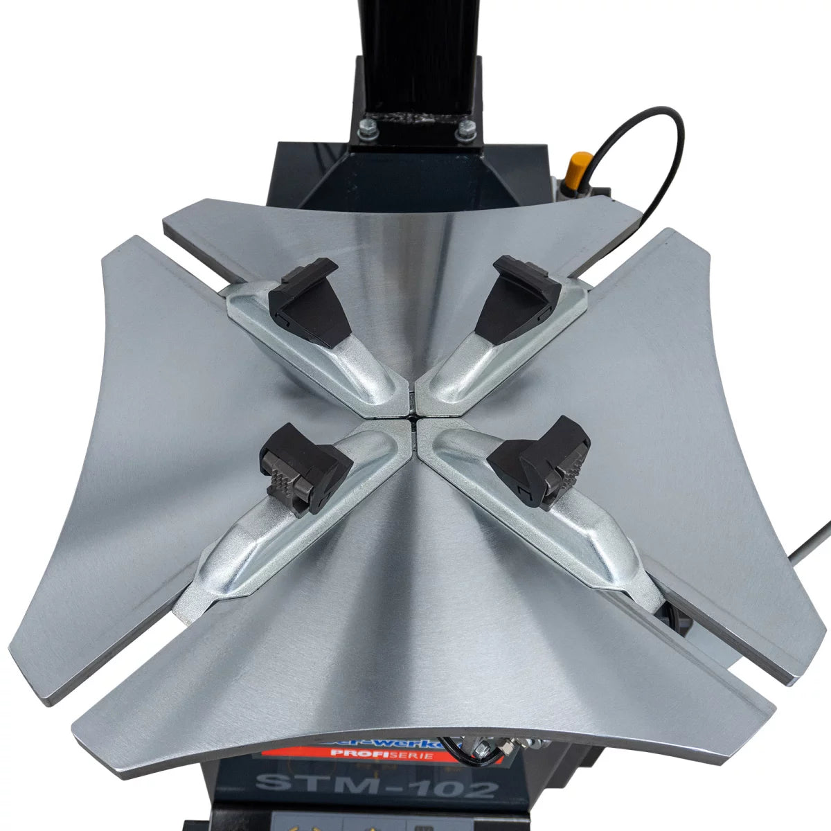 Die Reifenmontiermaschine STM-102 bietet zahlreiche Funktionen, die eine einfache und sichere Montage gewährleisten. Der seitlich schwenkbare Montagearm und die Excenter-Verspannung des Montagekopfes ermöglichen eine schnelle Justierung. Die Spannklauen aus hochfestem Stahl sorgen für ein sicheres Spannen der Felge von innen und außen, während der selbstzentrierende Spannteller für Felgengrößen bis 24" geeignet ist. Dies macht die STM-102 zur idealen Wahl für verschiedene Fahrzeugtypen. Die STM-102 ist mit einem Montagekopf ausgestattet, der über Aufnahmen für Kunststoffschutzelemente verfügt, um die Felge während des Montierens zu schützen. Dies macht sie besonders geeignet für hochwertige und empfindliche Felgen.
